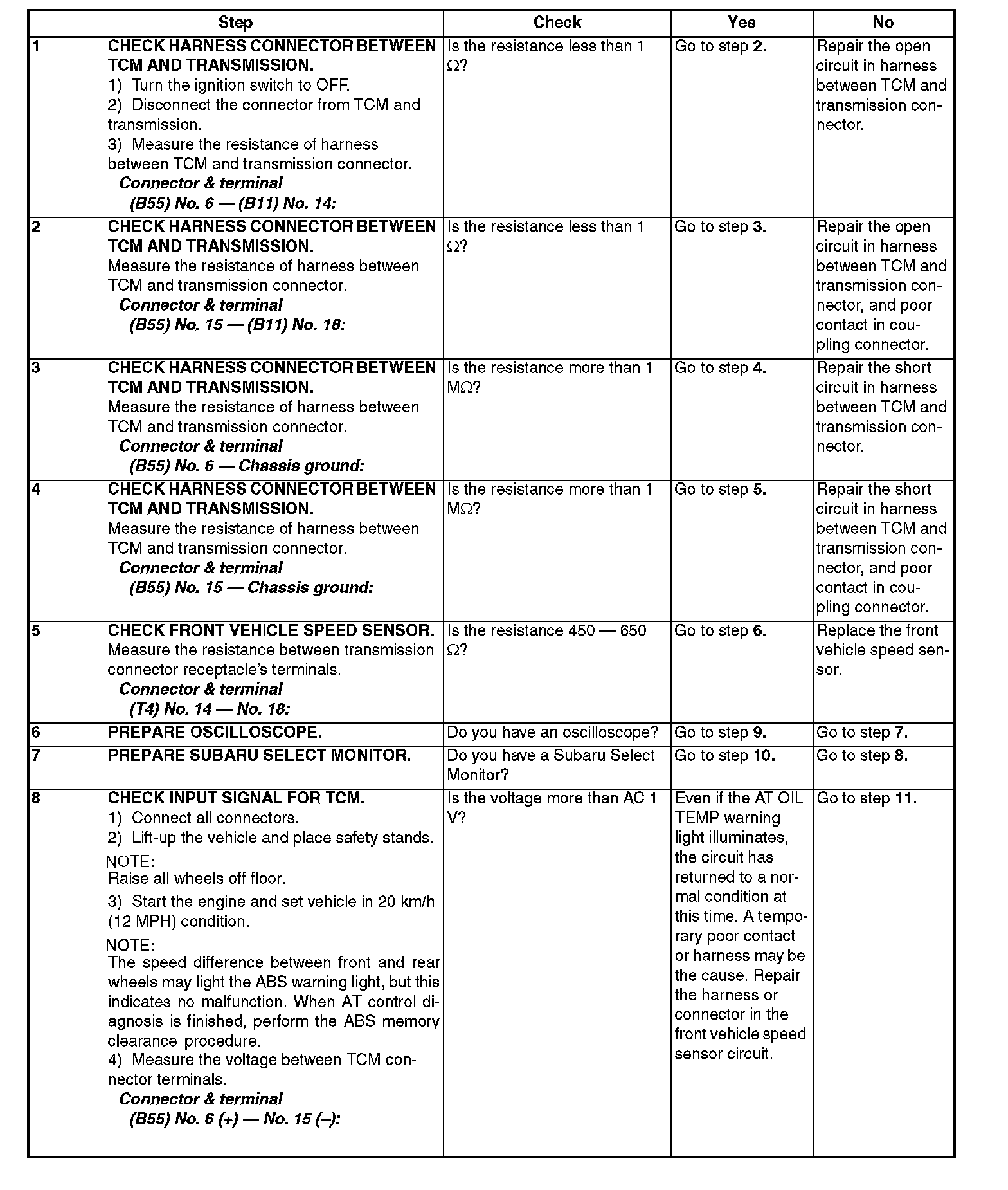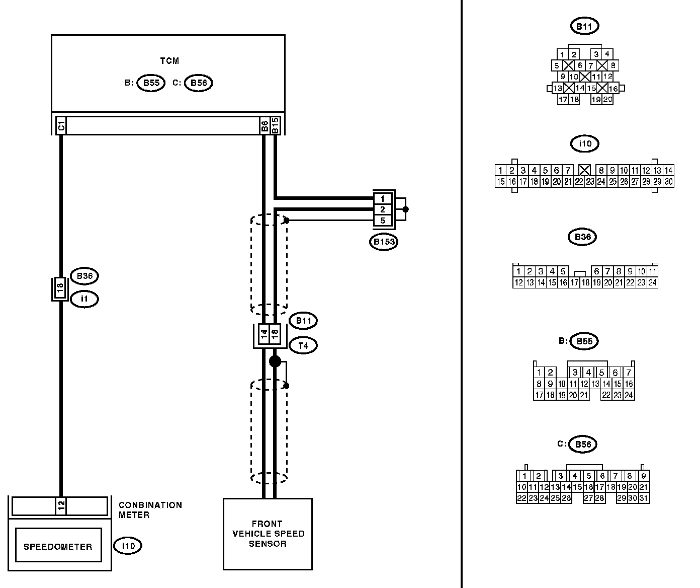 - The harness connector between TCM and vehicle speed sensor is in short or open.
