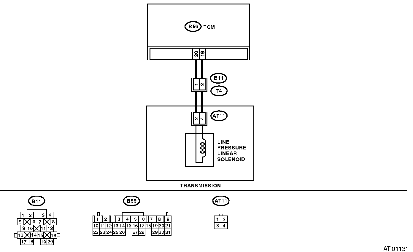 The output signal circuit of line pressure linear solenoid is open or shorted.