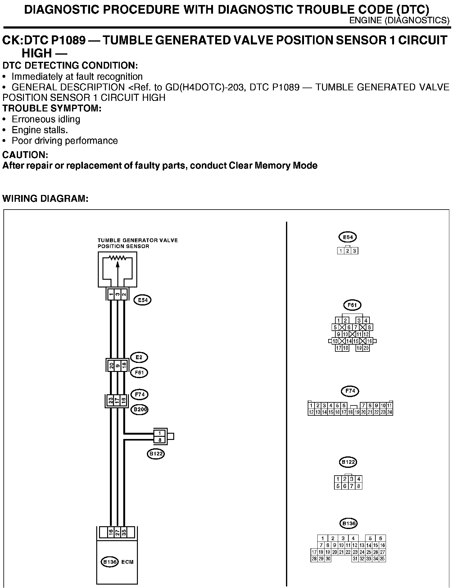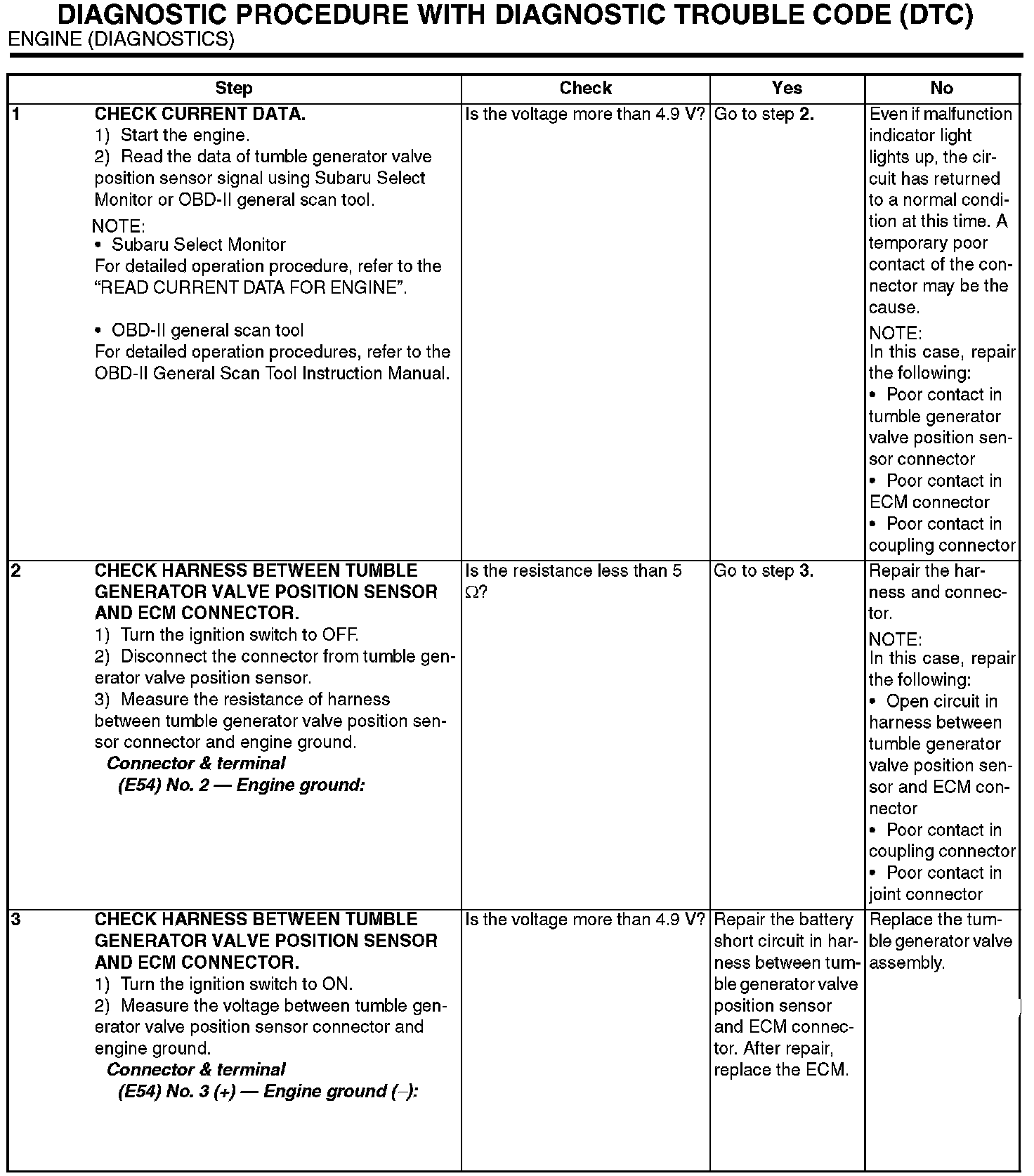 The content of this article/image reflects the changes identified in tsb 18_99_06 Dated 01/19/06 and applies to Legacy, Forester, Impreza and Baja models.DTC P1089 - TUMBLE GENERATED VALVE POSITION SENSOR 1 CIRCUIT HIGH