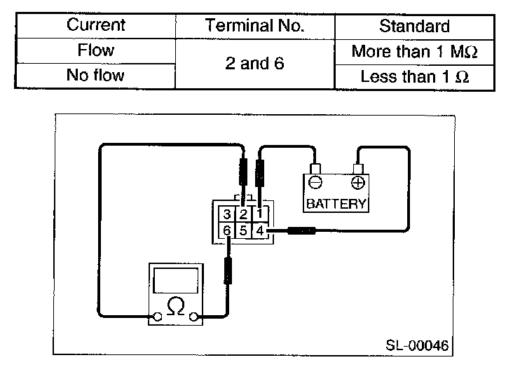 Measure the interrupt relay resistance between terminals (indicated in the table) when connecting terminal No. 4 to battery positive terminal and terminal No. 1 to battery ground terminal.