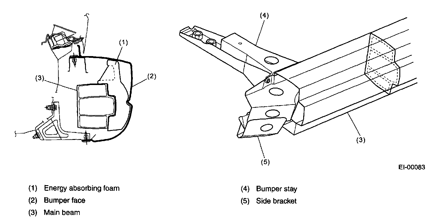 - The rear bumper consists of a bumper face, main beam, energy absorbing foam, side brackets, and bumper stays.