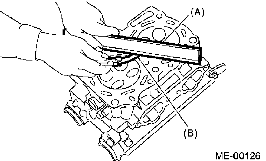 2. Measure the warping of the cylinder head surface that mates with crankcase by using a straight edge (A) and thickness gauge (B).