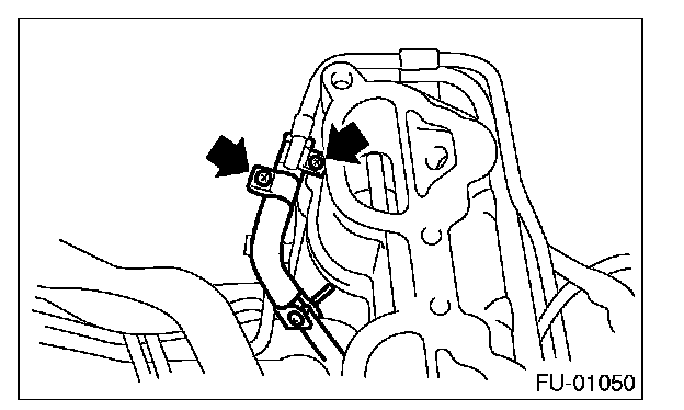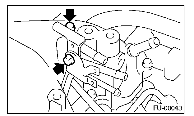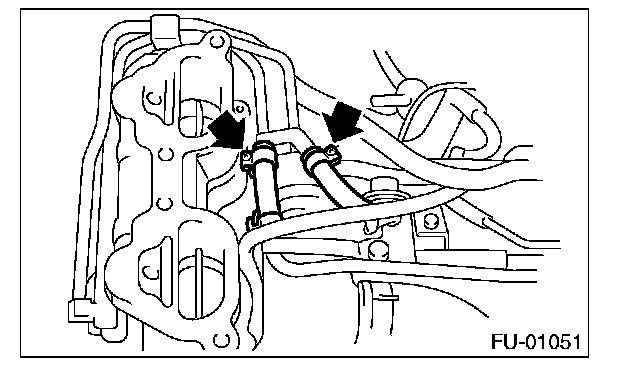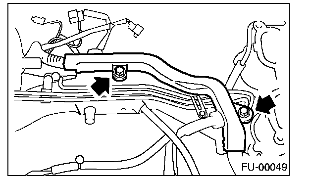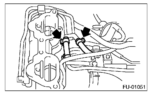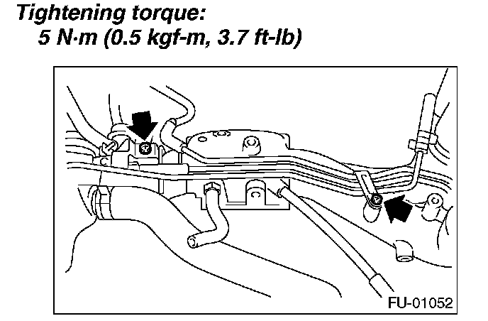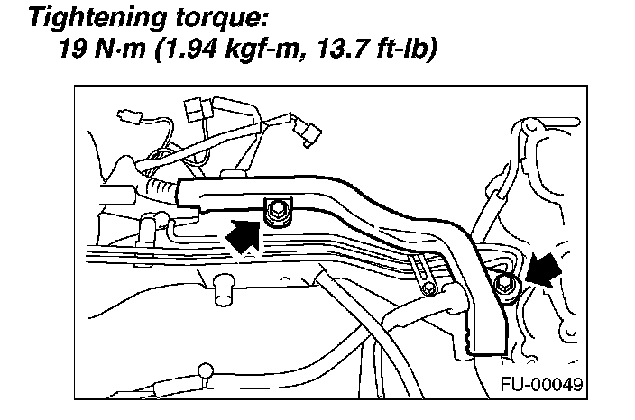 11. Tighten the two bolts which install the fuel pipes on the left side of intake manifold.