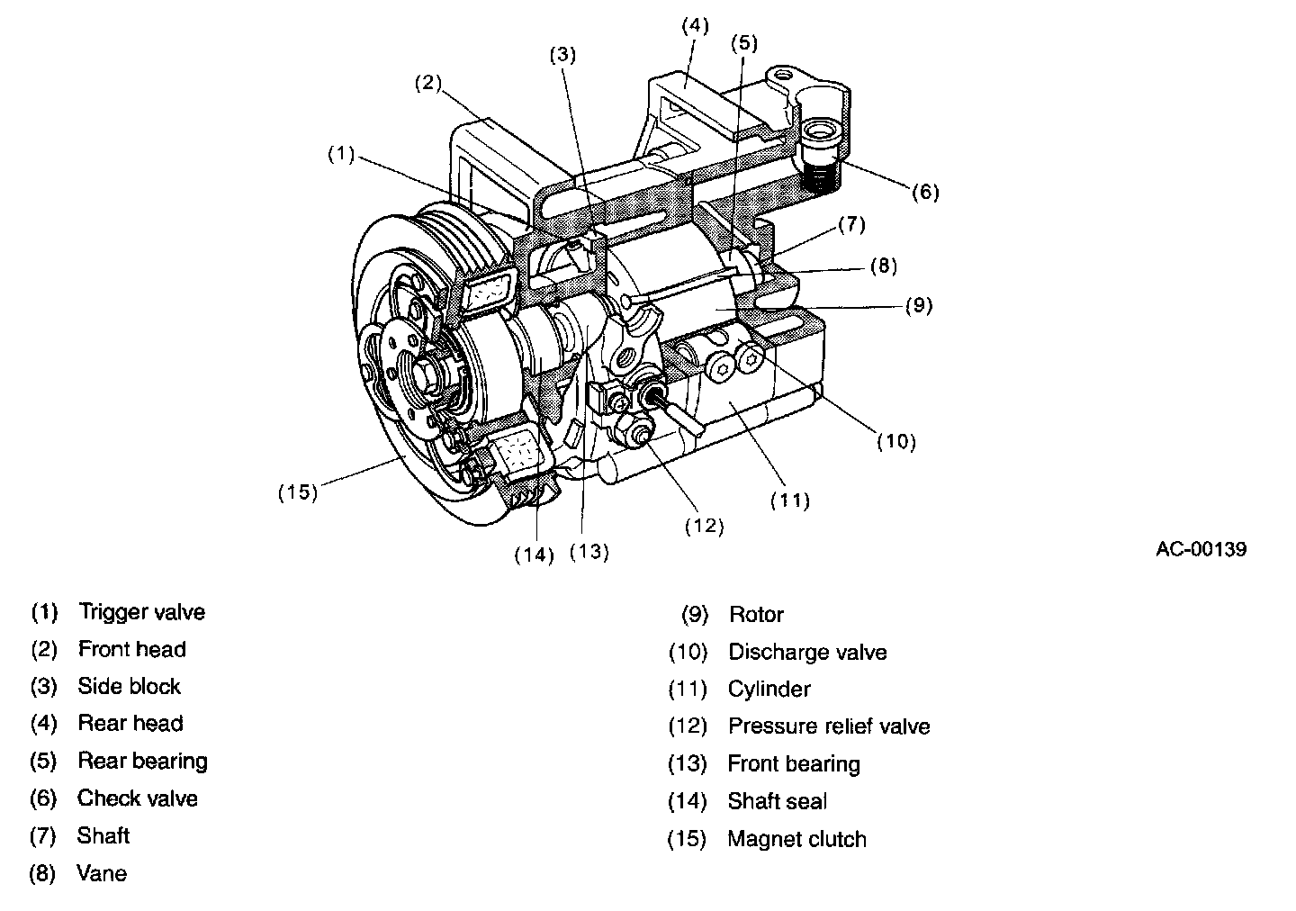 COMPRESSORThe rotary type compressor consists of an integrally formed rotor and shaft, five vanes, and a cylinder.