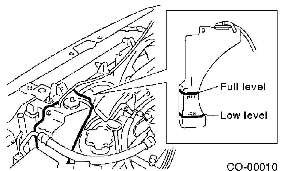 5. If the engine coolant level drops from Full level of reservoir tank, add engine coolant to Full level.