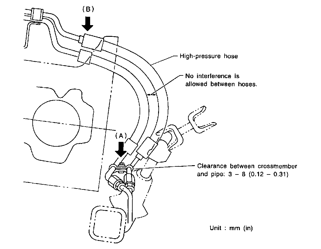 If cruise control actuator-to-power steering hose clearance is less than 10 mm (0.39 inch), move the portion (A) secured by clamp to other portion, or bend portion (B) to adjust.