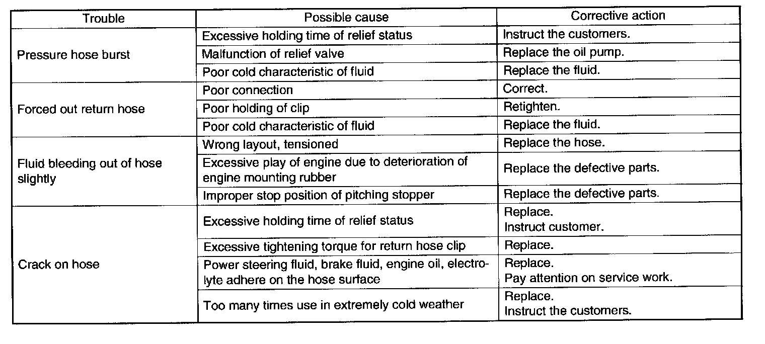 Since the resistances for heat or low temperature brittleness are gradually declining according to time accumulation of hot or cold conditions for the hoses and their service lives are shortening accordingly, it is necessary to perform the careful inspection frequently when the vehicle is used in hot weather areas, cold weather area and a driving condition in which many steering operations are required in short time.