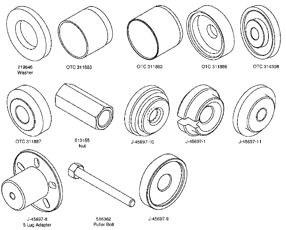26. Assemble the tools for wheel bearing installation. Place a washer on the bolt followed by OTC 311888 (open end facing toward the wheel bearing housing). Place another washer on the bolt followed by J45697-9. Apply the included grease to the puller bolt.