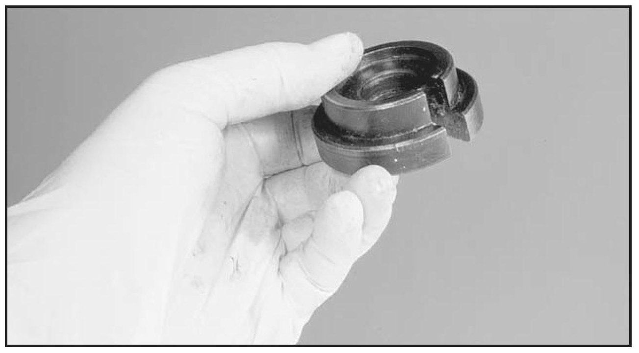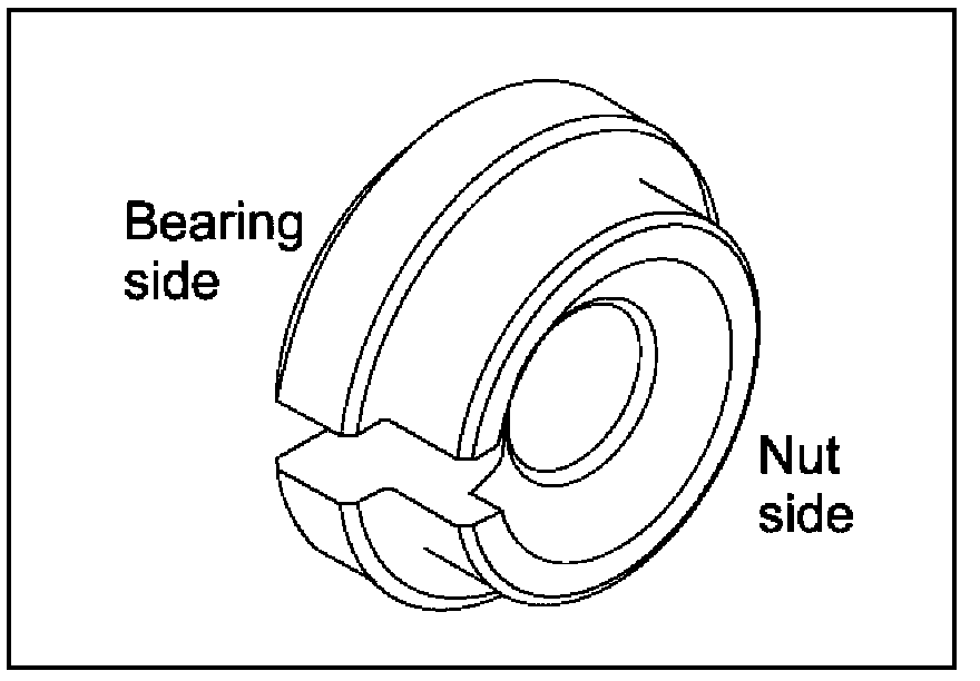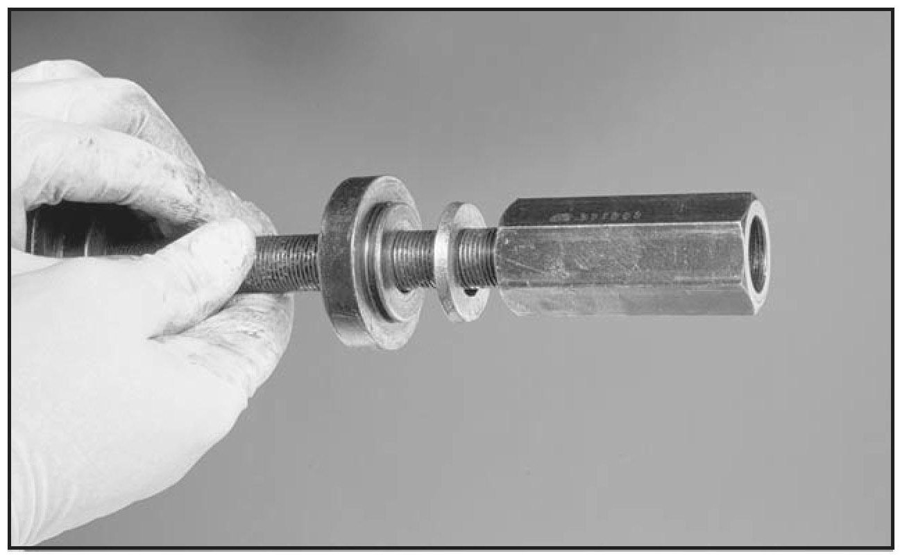 18. The OTC 311887 with washer and nut will be placed onto the opposite end of the puller bolt after it has been inserted into the bearing housing. If the wrong side of OTC 311887 is placed against the bearing the tool will become jammed into the inner race.
