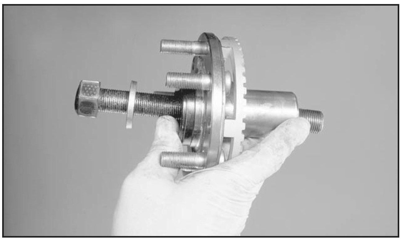 9. Connect the slide hammer to the wheel-bearing hub. Do not use the original wheel lug nuts. Note: After threading on the 5 lug adapter to the slide hammer, thread on the nut and tighten the adapter to the nut.