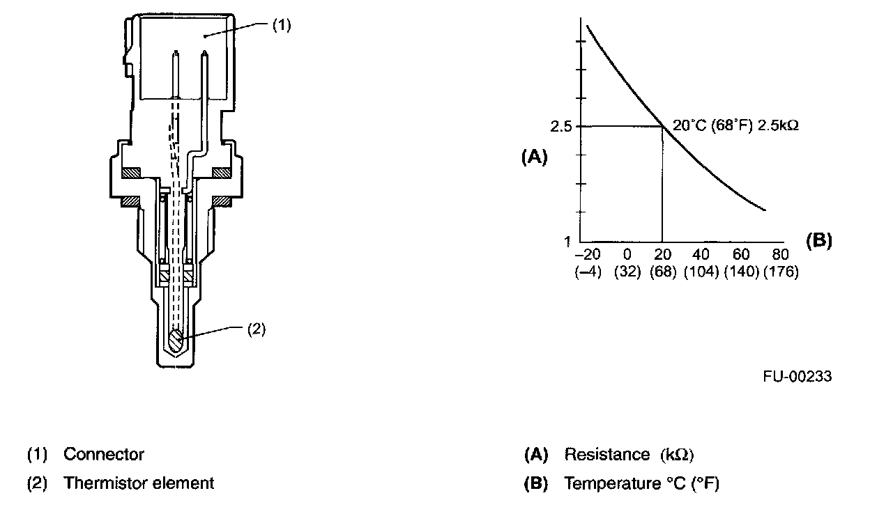 ENGINE COOLANT TEMPERATURE SENSORThe engine coolant temperature sensor is located on the engine coolant pipe. The sensor uses a thermistor whose resistance changes inversely with temperature. Resistance signals as engine coolant temperature information are transmitted to the ECM to make fuel injection, ignition timing, purge control solenoid valve and other controls.