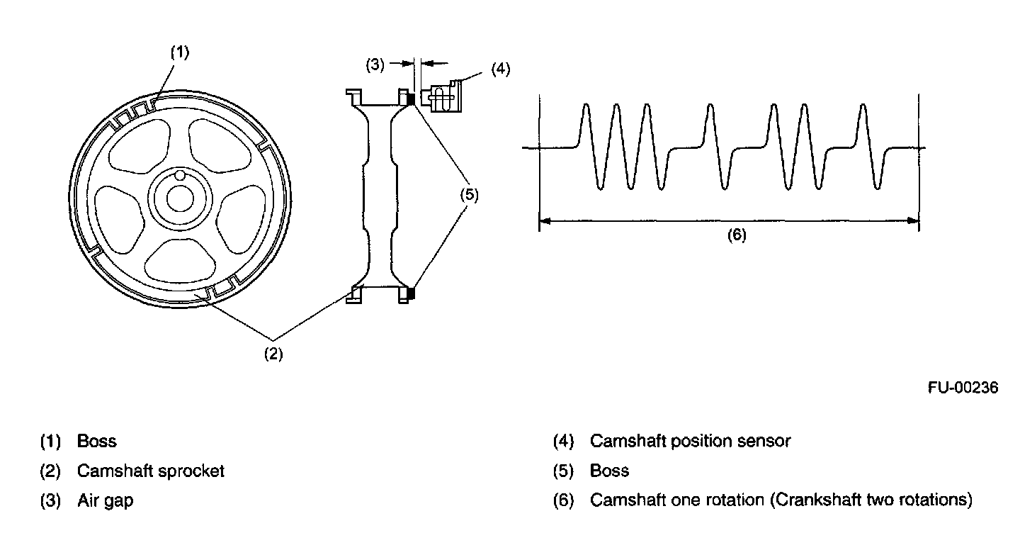 Internal construction and the basic operating principle of the camshaft position sensor are similar to those of the crankshaft position sensor. A total of seven bosses are arranged at equally spaced four locations (one each at two locations, two at one location, and three at one location) of the sprocket as shown.