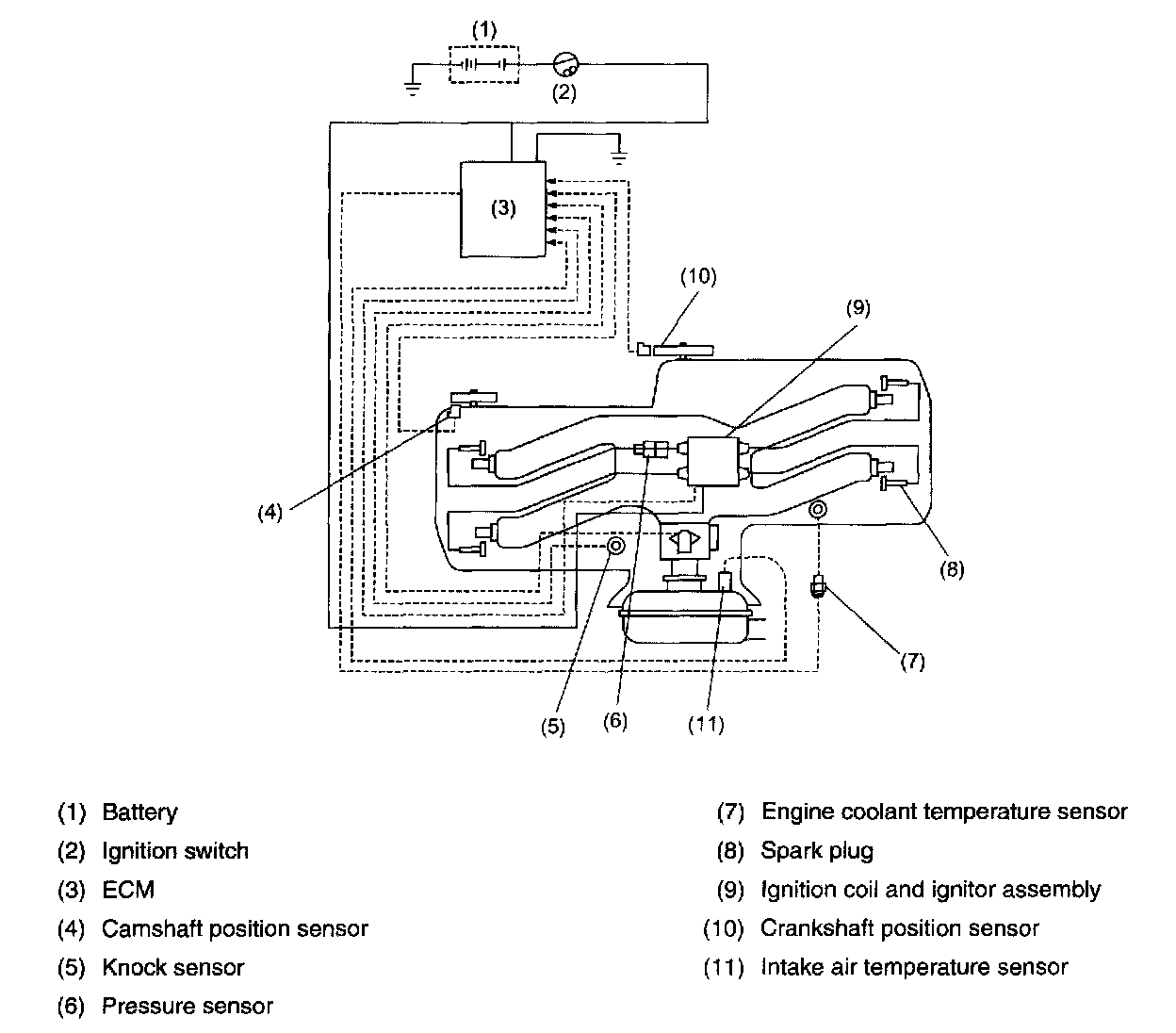 The ECM monitors the operating condition of the engine using the signals from the sensors and switches shown above and determines the ignition timing most appropriate for each engine operating condition. Then it sends a signal to the ignitor, commanding generation of a spark at that timing.