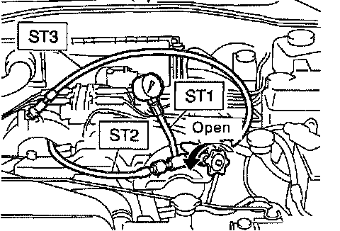 ^ Do not leave the valve of pressure gauge closed or hold the steering wheel at stop end for 5 seconds or more in any case, as the oil pump may be damaged due to long keep of these conditions.