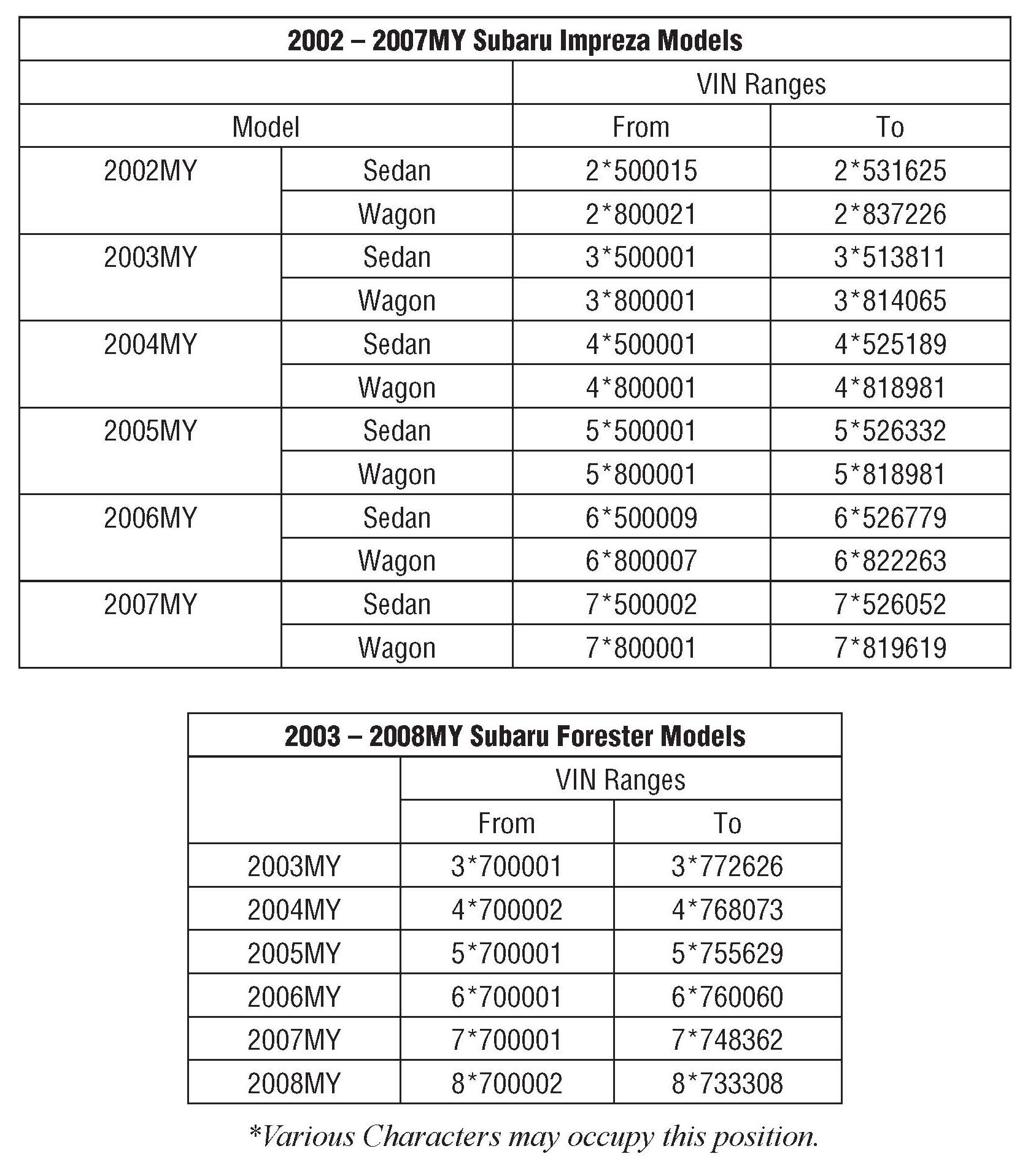 Affected vehicles are identified in the VIN range chart. NOTE: Not all vehicles within the range are affected. Coverage for all affected vehicles must be confirmed by using the Vehicle Coverage Inquiry function at Subarunet.com.
