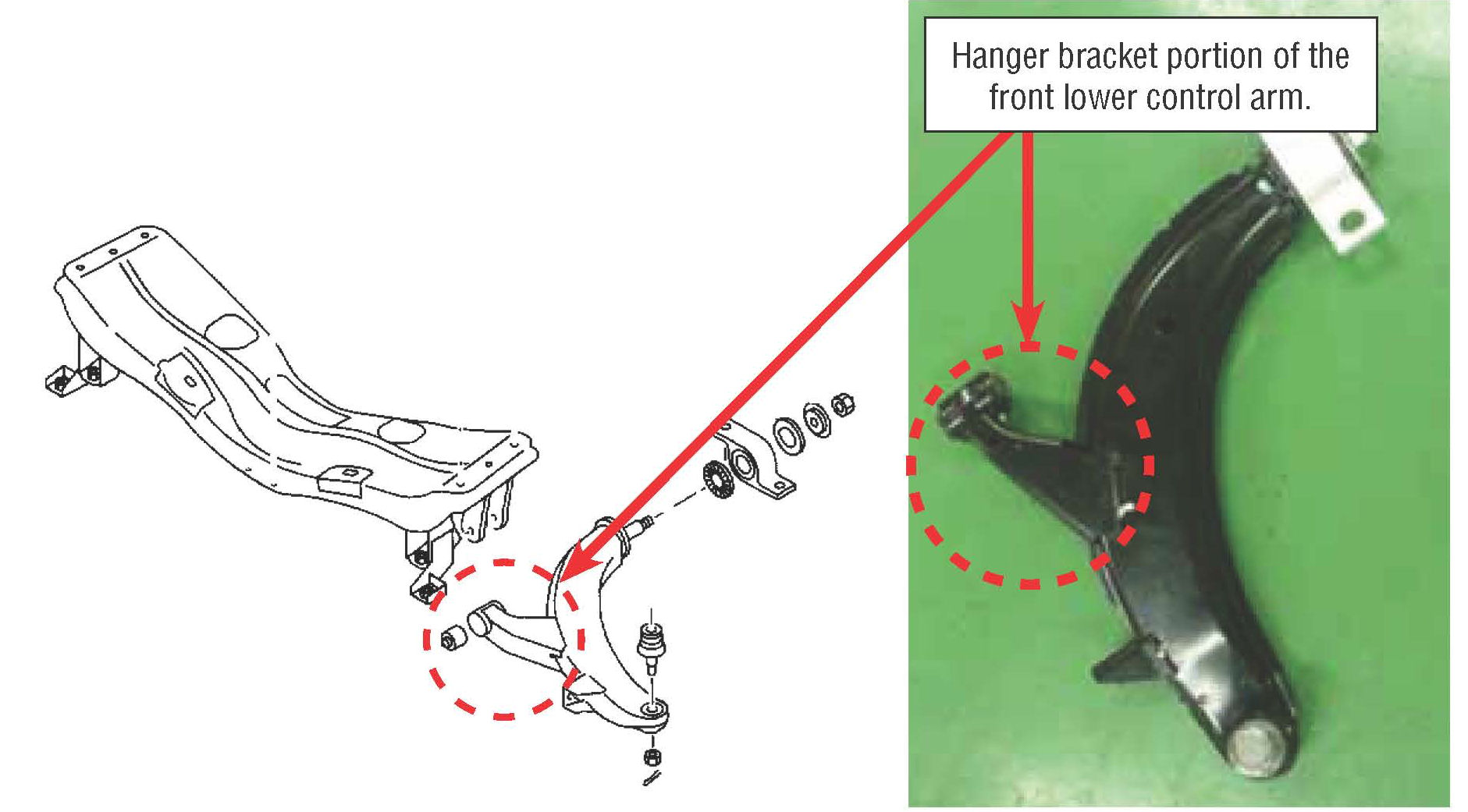 This repair procedure will involve inspecting and testing the current condition of the front lower control arms:1) visual inspection of the hanger bracket portion of both front lower control arms for rust perforation