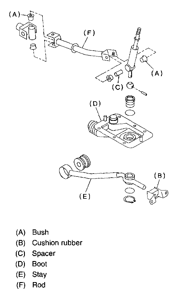 1. Check each part (bush, cushion rubber, spacer boot, stay and rod, etc.) for deformation, damage and wear. Repair or replace any defective part. Determine defective parts by comparing with new parts.
