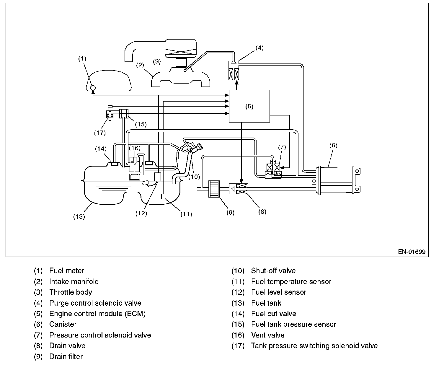 Fuel system is diagnosed by comparing the target air fuel ratio calculated by ECM with the actual air fuel ratio measured by sensor.