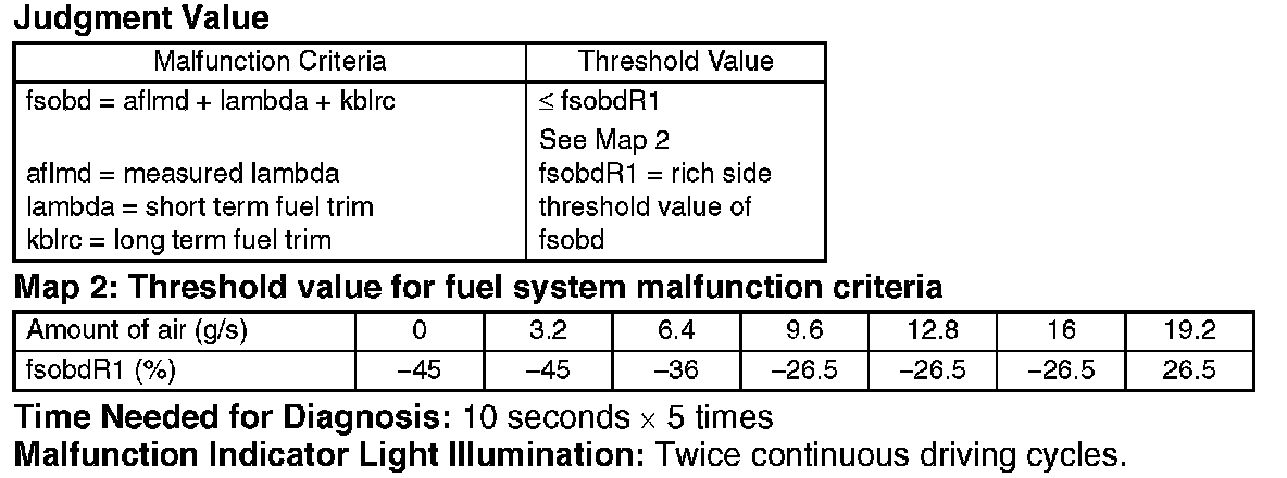 Judge that the malfunction occurred in fuel system when the malfunction criteria are completed for 50 seconds or more by comparing the diagnostic value (fsobd) with threshold value.