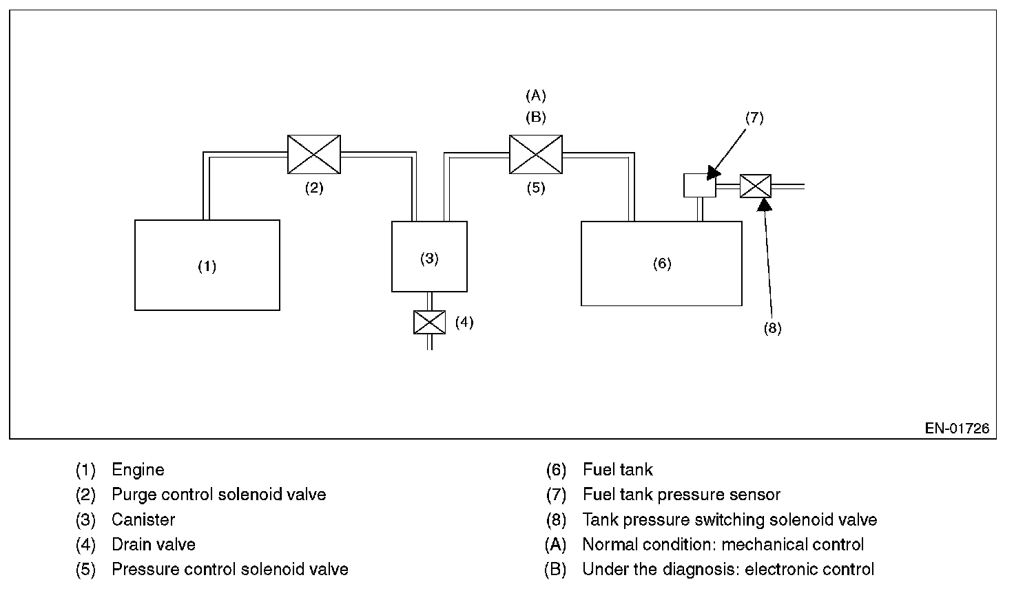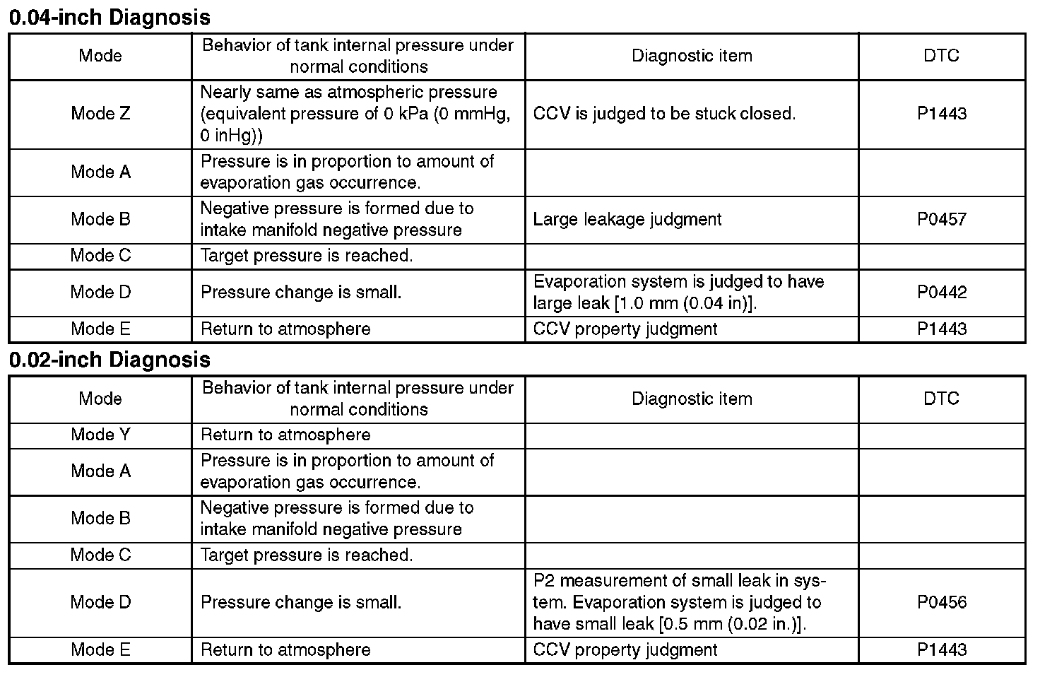 In this system diagnosis, checking for leakage and valve function is conducted by changing the fuel tank pressure, and monitoring the pressure change using the fuel tank pressure sensor. 0.04 inch diagnosis is performed in the order of mode Z, mode A, mode B, mode C, mode D and mode E, and 0.02 inch diagnosis is performed in the order of mode Y, mode A, mode B, mode C, mode D and mode E.
