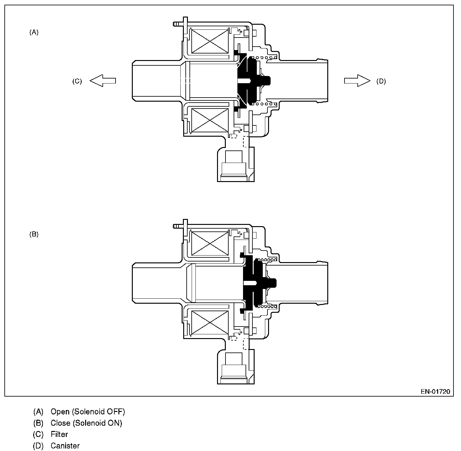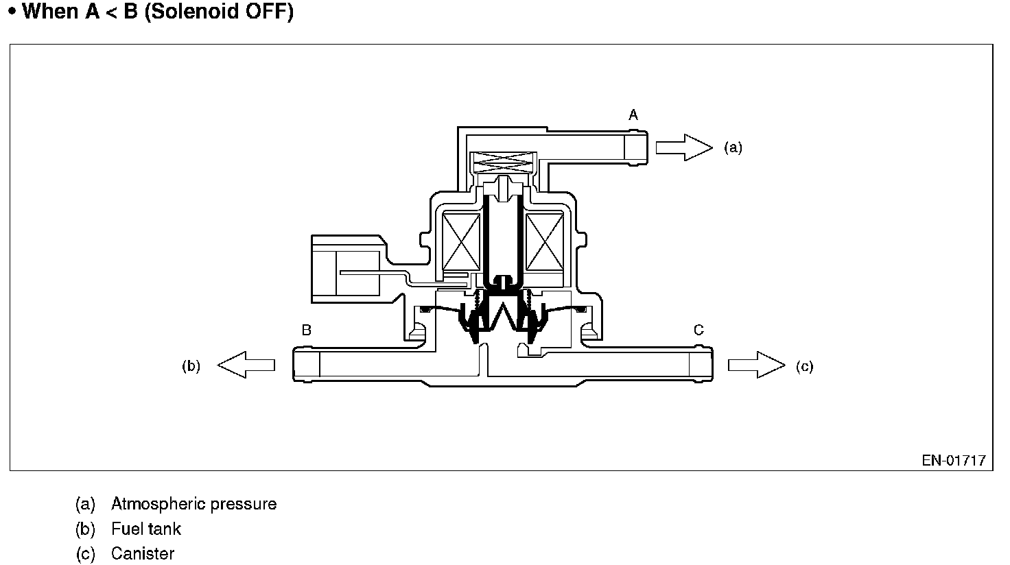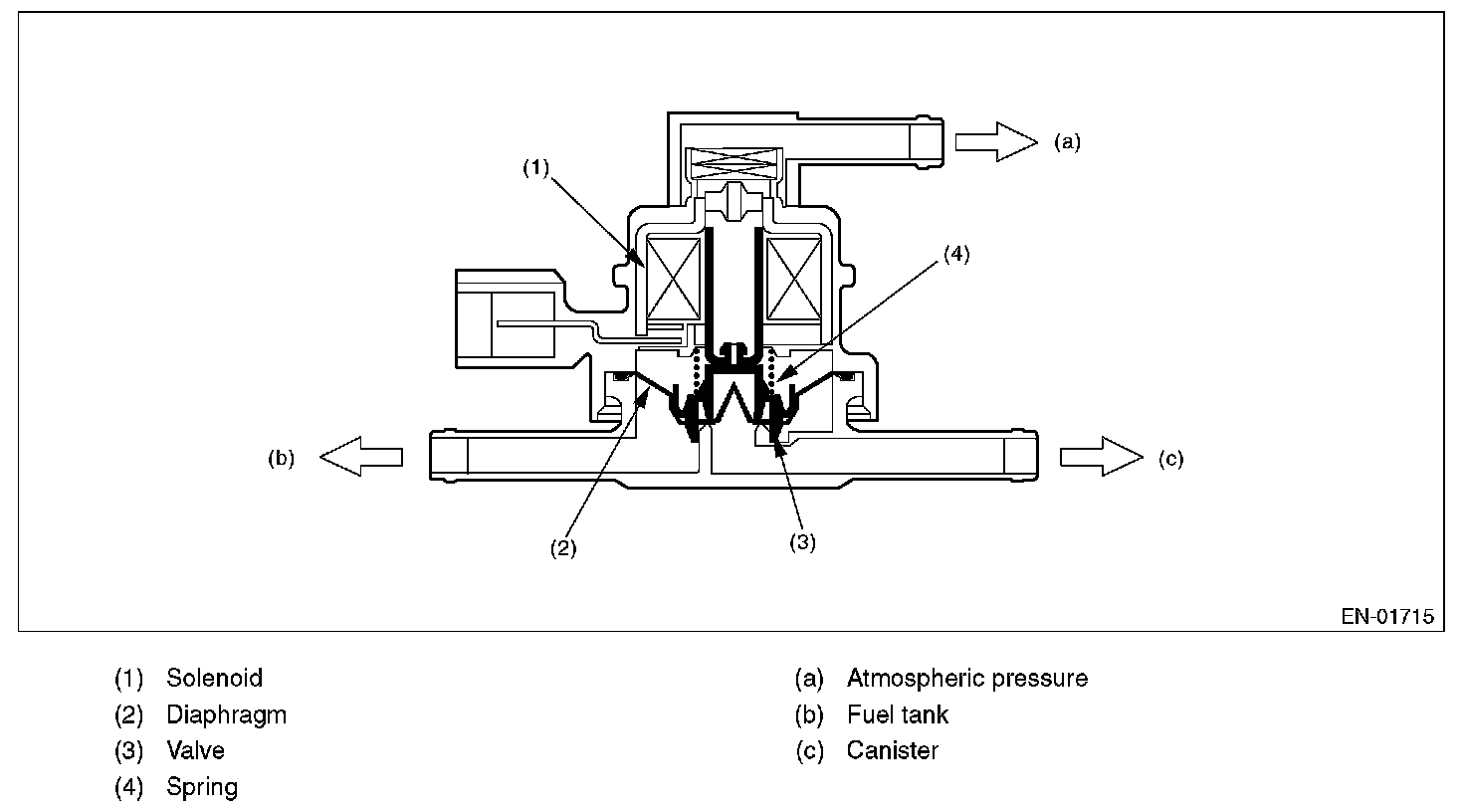 Normally, the solenoid is set to OFF. And the valve opens and closes mechanically in accordance with the pressure difference between tank and atmospheric air, or tank and canister.