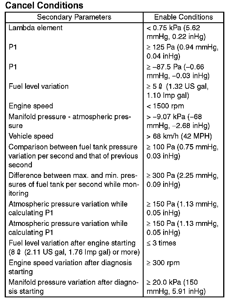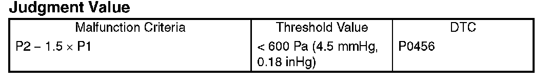 Perform the diagnosis under the conditions, and return the tank pressure to atmosphere. Tank pressure > 0.9 kPa (67.5 mmHg, 2.7 inHg) after 0.1 seconds: