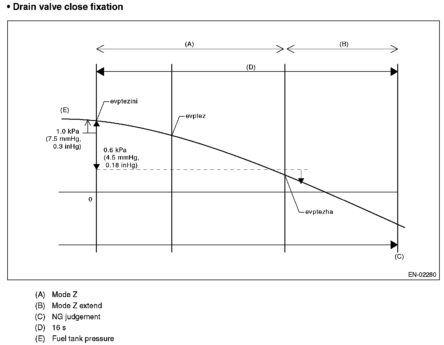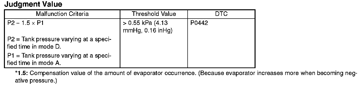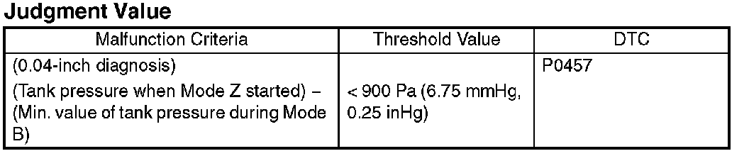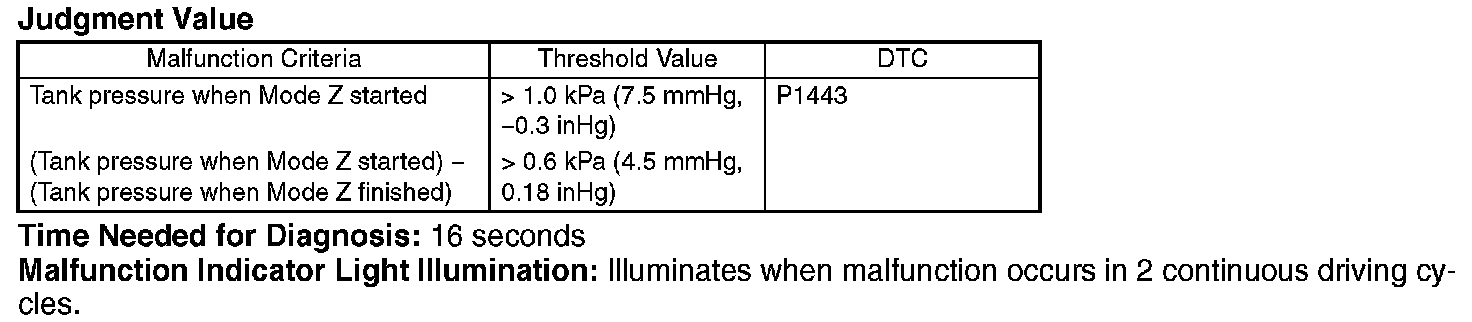Introduce the negative pressure in the intake manifold to the tank. Approx. 0 -> -1.4 kPa (0 -> -5 mmHg, 0 -> -0.41 inHg) (0.04-in diagnosis) Approx. 0 -> -3.05 kPa (0 -> -22.9 mmHg, 0 -> -0.9 inHg) (0.02-in diagnosis) When the pressure above (desired negative pressure) is reached, Mode C is entered. In this case, if the tank pressure does not become the desired negative pressure, judge that there is a large leakage in the system.