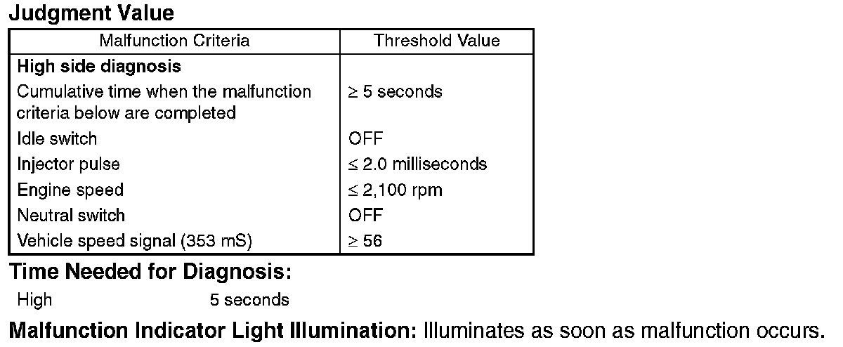 Judge NG when the time of completing the malfunction criteria becomes more than time needed for diagnosis. Judge OK when the vehicle speed is more than 4 km/h (2.5 MPH) and less than 224 km/h (140 MPH).