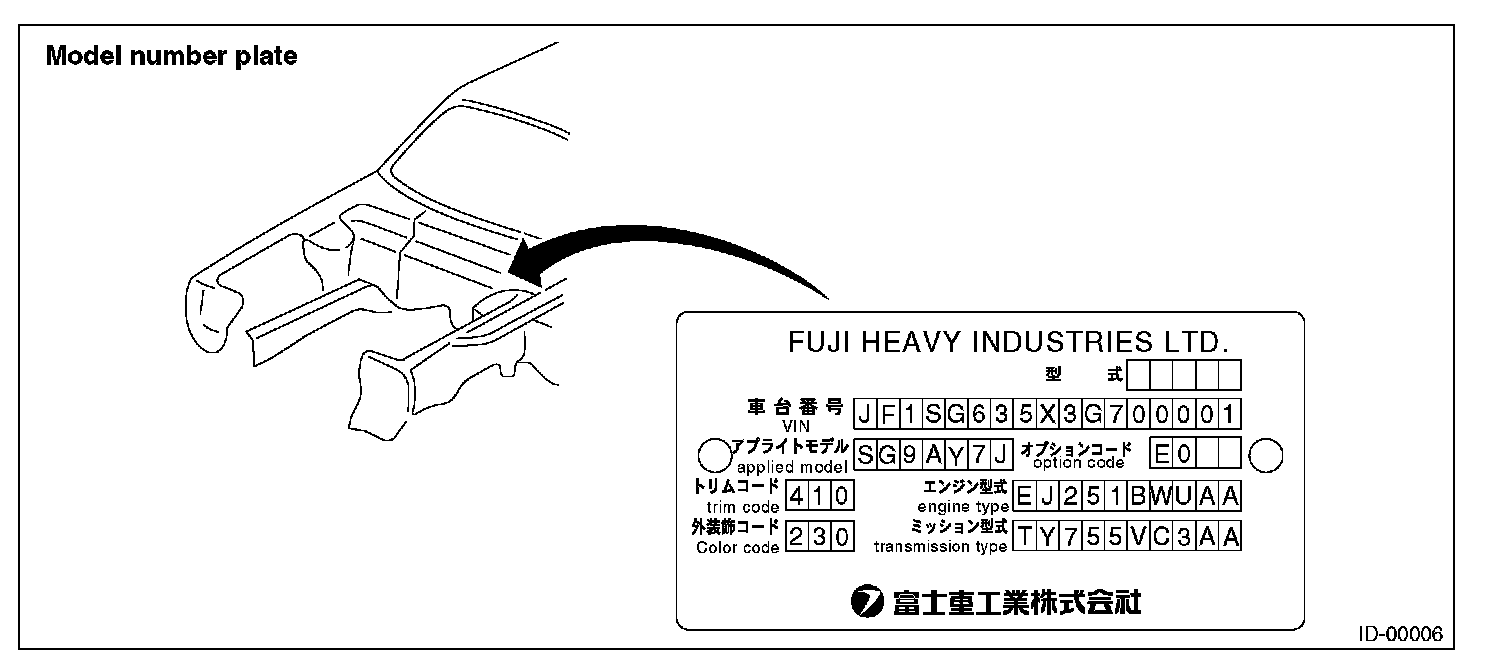 The model number plate indicates: the applied model, the option code, the trim code, the engine type, the transmission type, and the exterior color code. This information is helpful when placing orders for parts.