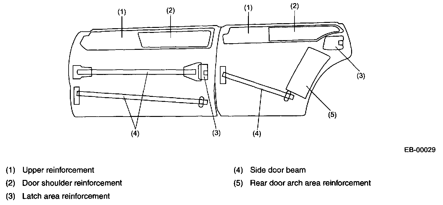 DOOR CONSTRUCTION- All the front and rear doors have side door beams (two on front doors and one on rear doors), a door shoulder reinforcement, a latch area reinforcement, and an arch area reinforcement.