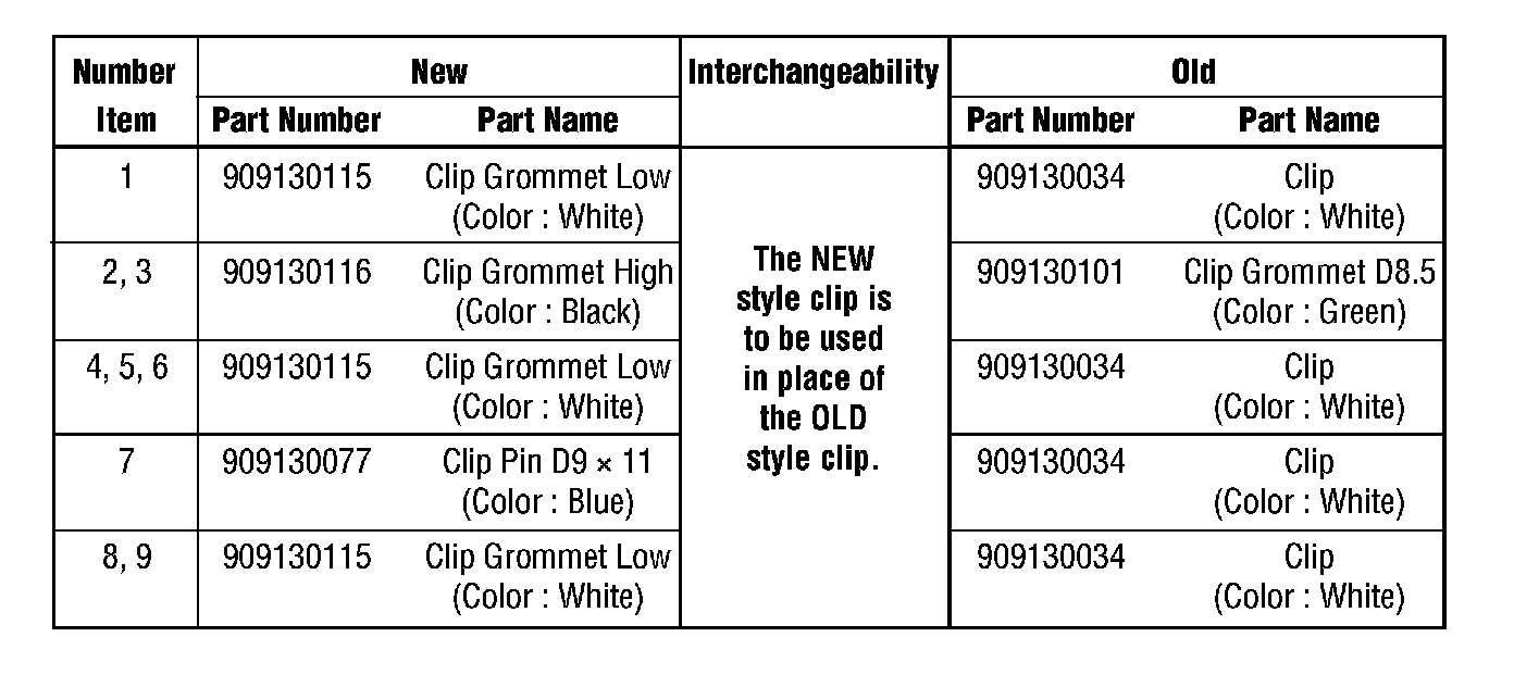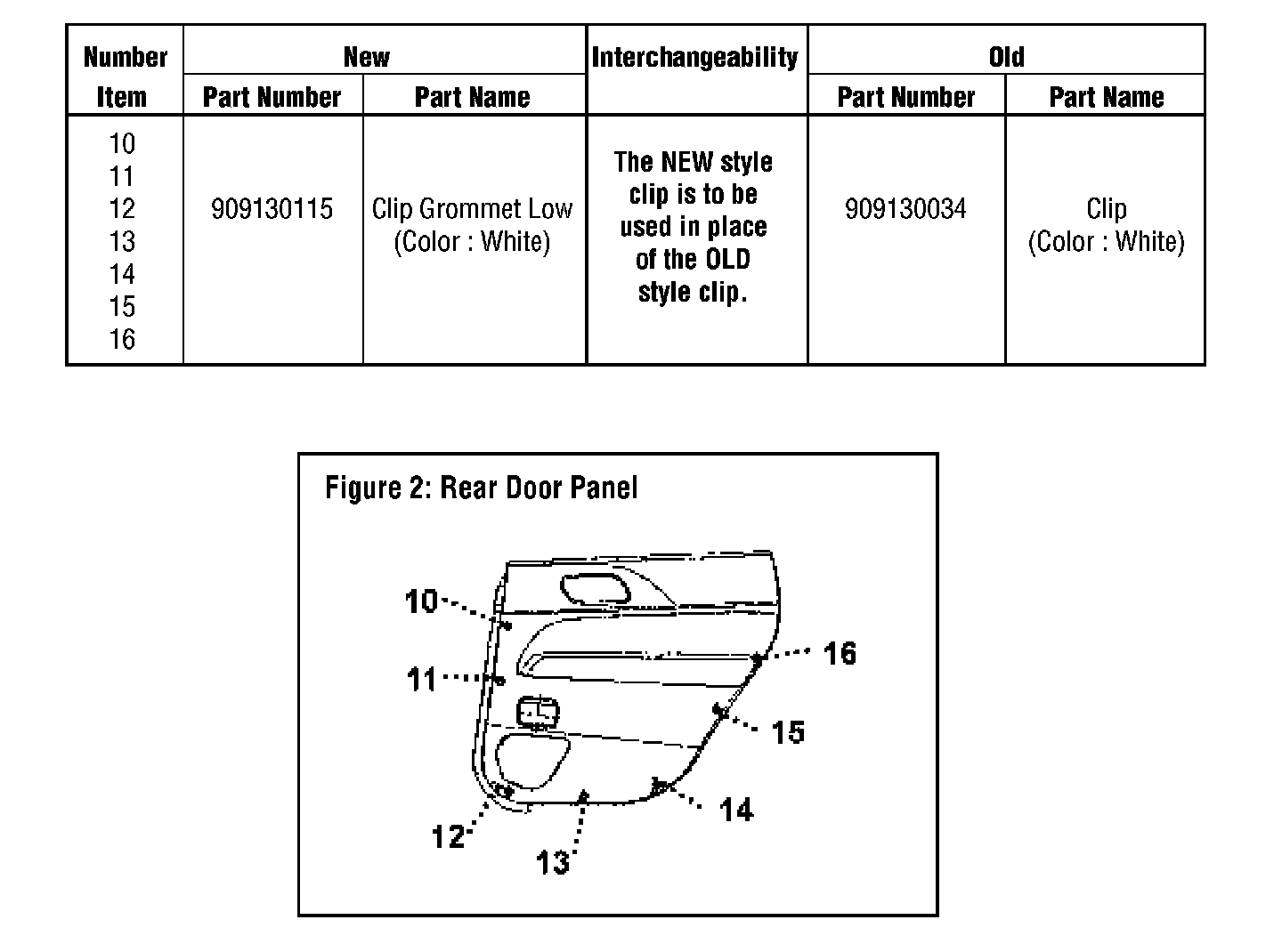 In order to prevent noise from the door trim panel and breakage of the door trim panel clips during removal and reinstallation, the clips have been changed. This Service Bulletin informs of new part numbers and interchangeability between the new and the old clips.