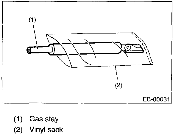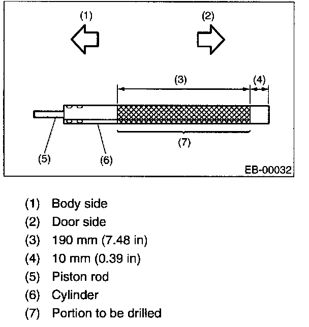 2. Lift the body side slightly with piston rods fully extended, and secure the body side on vise stand. Drill a hole in 2 to 3 mm (0.08 to 0.12 in) diameter at a point 10 to 200 mm (0.39 to 7.87 in) from the door side, and bleed the gas stay completely.