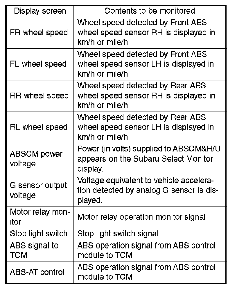 ^ If a particular DTC is not properly stored in memory (due to a drop in ABSCM&H/U power supply, etc.) when a problem occurs, the DTC, followed by a question mark "T", appears on the Subaru Select Monitor display. This shows it may be an unreliable reading.