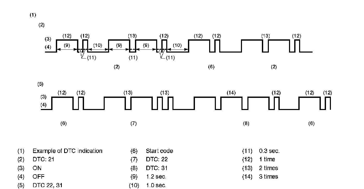 6. After the start code (11) is shown, the DTCs will be shown in order of the last information first. These repeat for a maximum of 3 minutes.
