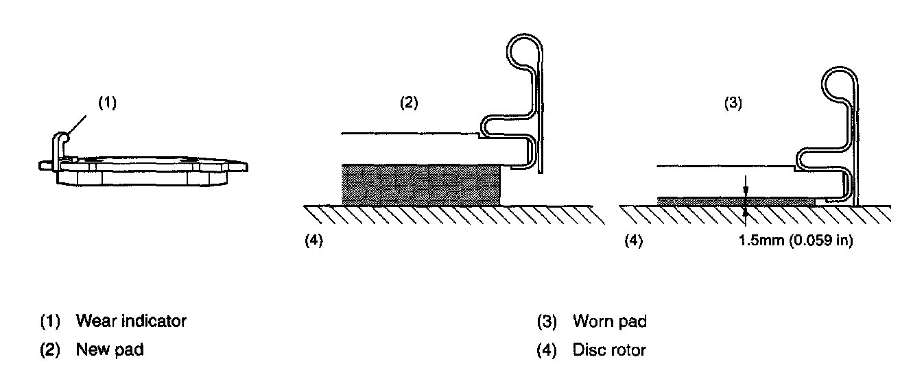 A wear indicator is provided on the inner disc brake pads. When the pad wears down to 1.5 mm (0.059 inch) the tip of the wear indicator comes into contact with the disc rotor, and makes a squeaking sound as the wheel rotates. This alerts the driver to the situation.