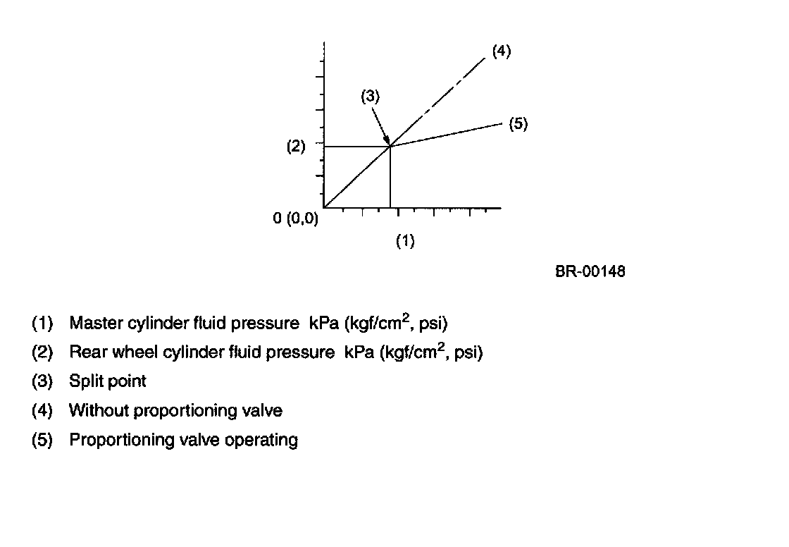 Proportioning Valve (Models with Rear Drum Brake)The proportioning valve prevents the rear wheels from locking and resultant skidding that would occur during hard braking due to transfer of vehicle weight toward the front wheels. The valve distributes a reduced pressure to the rear wheel brakes as compared with the pressure to the front wheel brakes when a specified master cylinder fluid pressure (called "split point") is exceeded as shown in the diagrams below.
