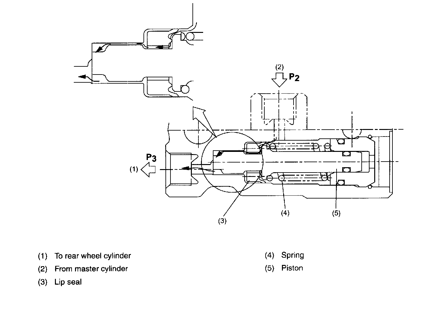 Immediately before the fluid passage toward the rear wheel cylinders is closed, pressure "P2" is slightly higher than pressure "P3". So the piston can move in the spring force acting direction and the fluid can flow to the wheel cylinders. However, as soon as pressure "P2" becomes equal to "P3", the passage closes.