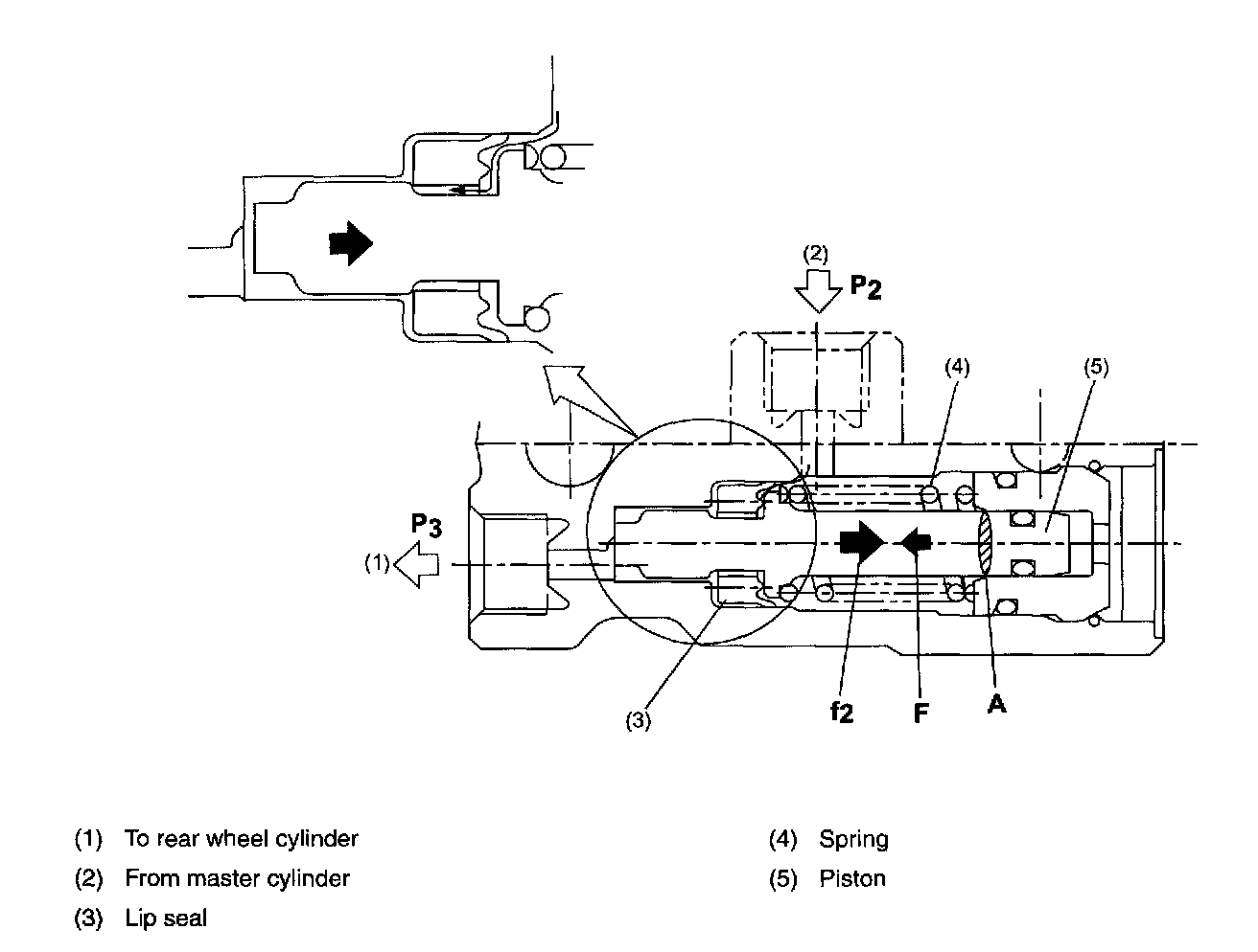 When pressure "P2" increases to the split point pressure, force "f2" is generated. (Piston's cross sectional area "A" has been selected so that the force is generated starting with the split point pressure.) The pressure pushes the piston rightward, overcoming spring force "F". As a result, the piston moves rightward and comes in contact with the lip seal, blocking the passage toward the rear wheel cylinders.