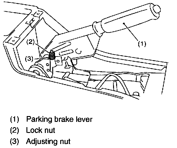 3) Adjust the parking brake lever by turning adjuster until parking brake lever stroke is set at 7 to 8 notches with operating force of 196 N (20 kgs, 44 lbs.).
