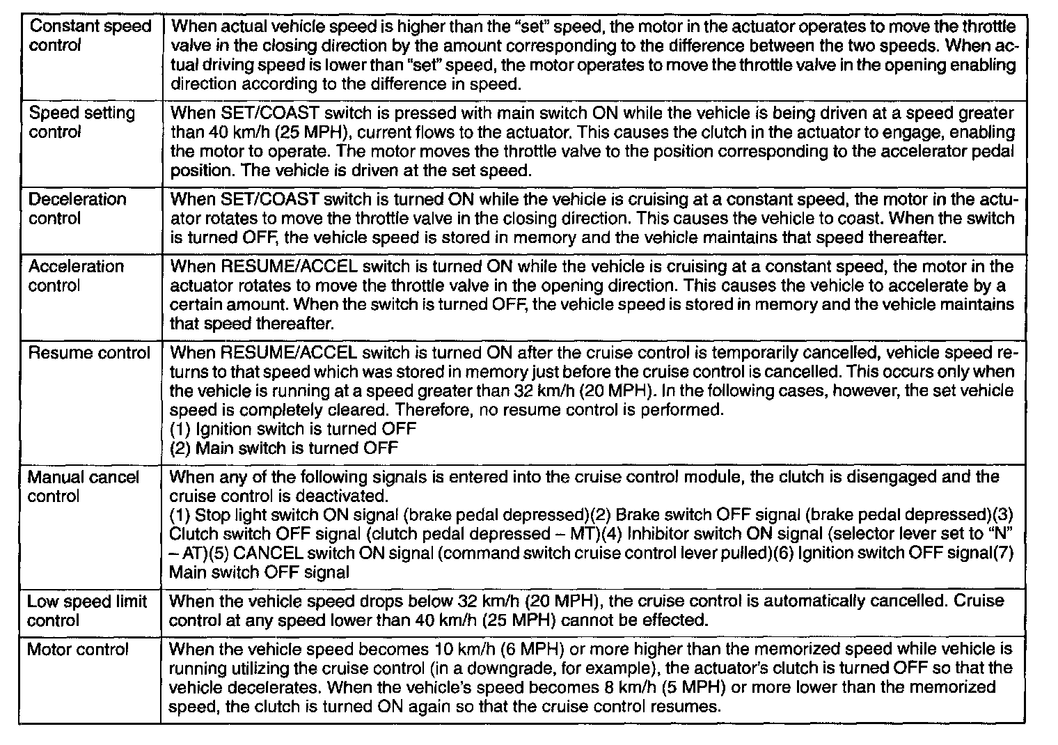 - Based on signals from the related switches and sensors, the cruise control module controls all the following control functions: