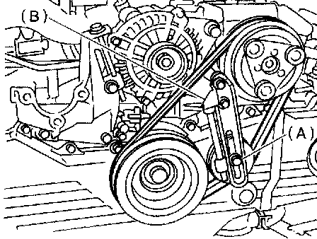 1. Install the belt, and tighten the slider bolt (B) so as to obtain the specified belt tension.