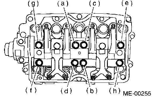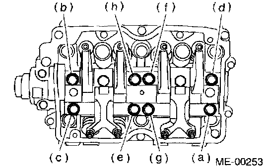 NOTE: Leave two or three threads of bolts (g and h) engaged to retain the valve rocker assembly.