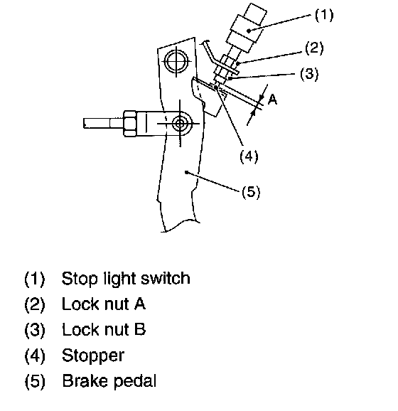 Loosen the lock nut, and adjust the stop light switch position until the clearance between threaded end of stop light switch and stopper (A) becomes 0.3 mm (0.012 inch). Then, tighten the lock nut.