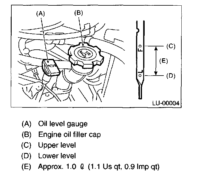 6. Just after driving or while the engine is warm, engine oil level may show in the range between the "F" line and notch mark. This is caused by thermal expansion of the engine oil.