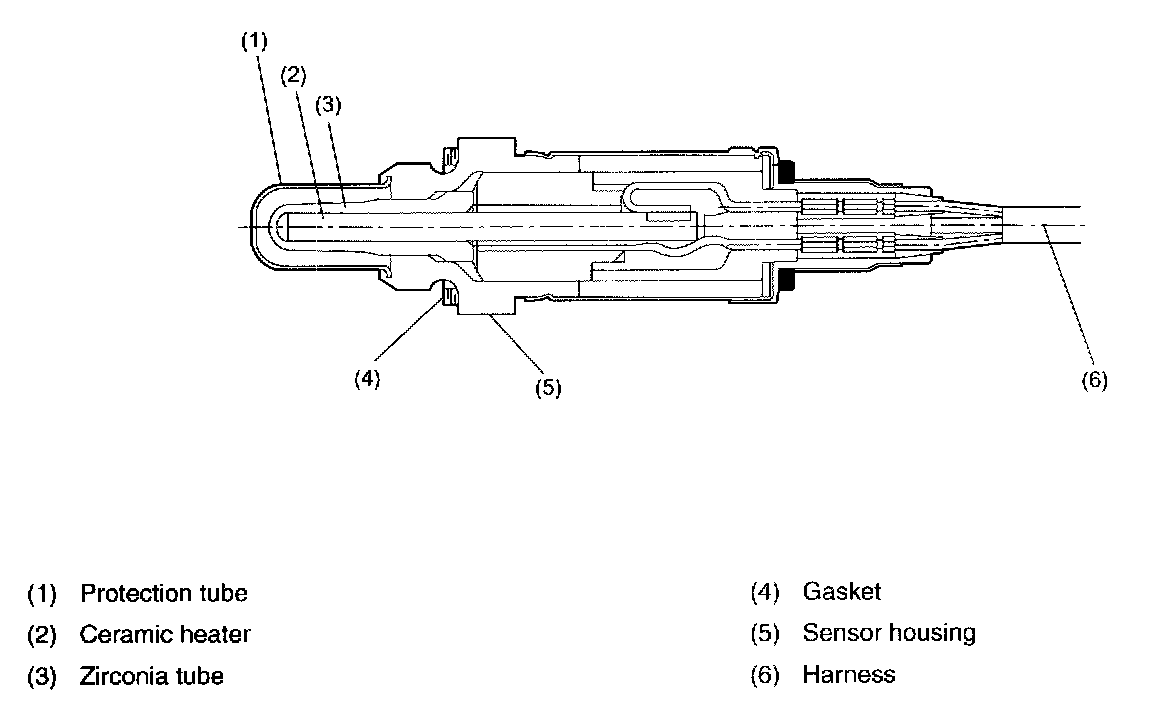 - The rear oxygen sensor has a zirconia tube (ceramic) which generates voltage if there is a difference in oxygen ion concentration between the inside and outside of the tube. Platinum is coated on the inside and outside of the zirconia tube as a catalysis and electrode material. The sensor housing is grounded to the exhaust pipe and the inside is connected to the ECM through the harness.