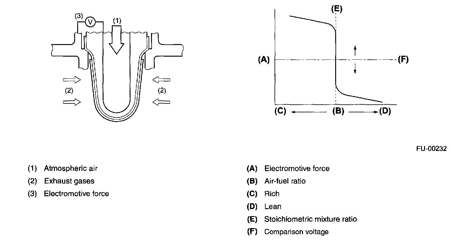 - When a lean air-fuel mixture is burnt in the cylinder, relatively large amount of oxygen remains in the exhaust gases even after the catalytic action, and this results in a small difference in the oxygen ion concentration between the tube's internal and external surfaces. The electromotive force in this case is very small.
