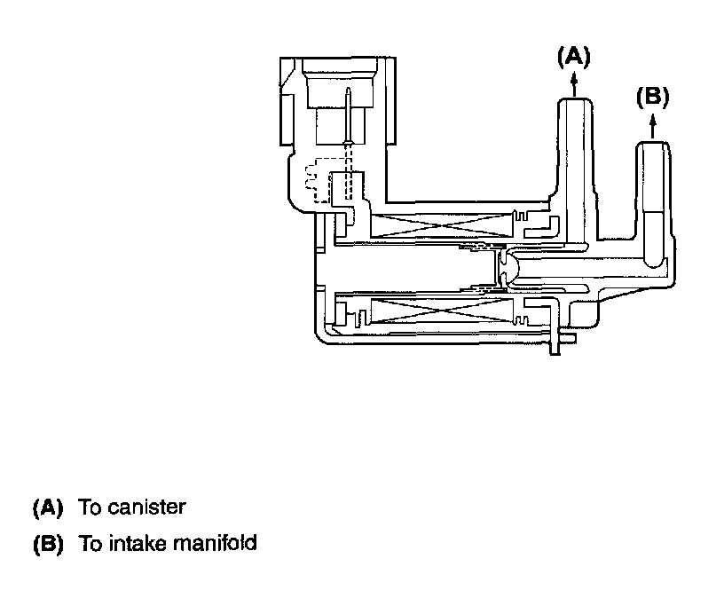 The purge control solenoid valve is on the evaporation line between the canister and intake manifold. The valve is installed at the underside of intake manifold.