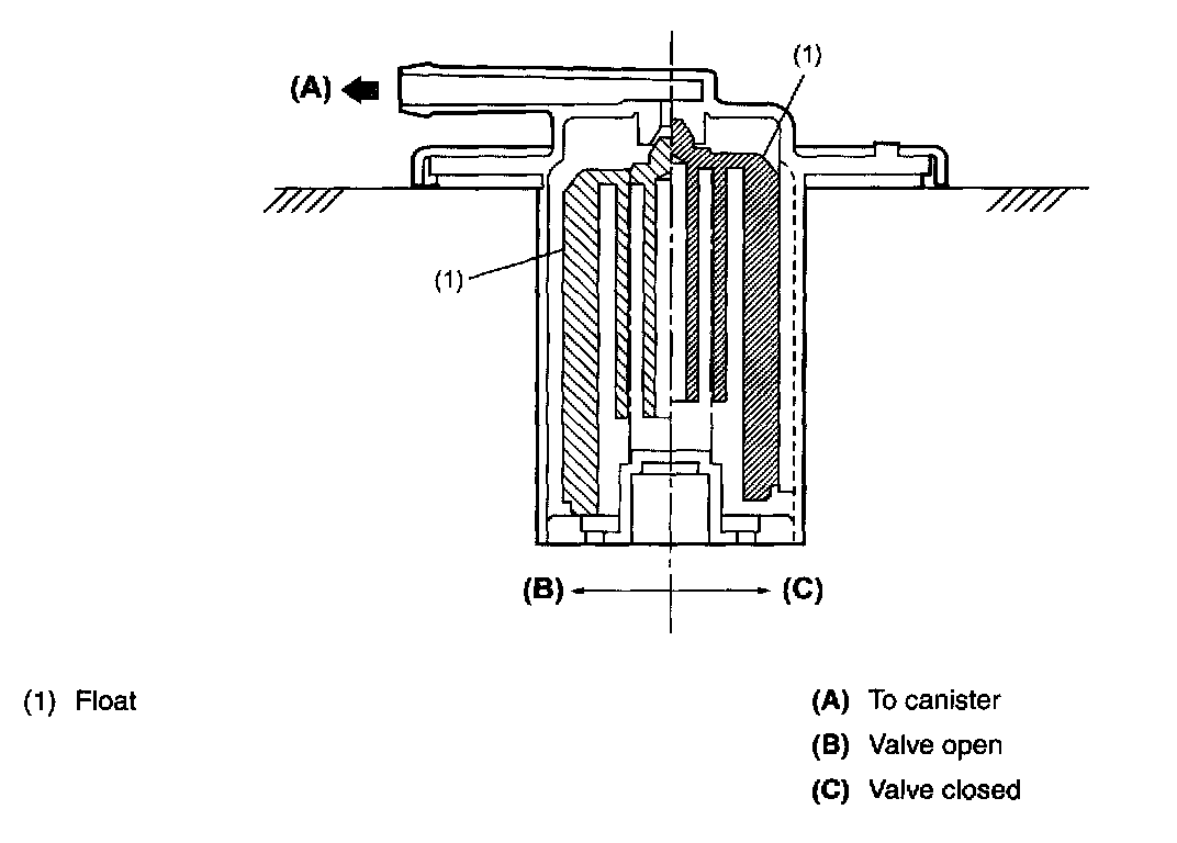 FUEL CUT VALVEThe fuel cut valve is built onto the evaporation pipe of the fuel tank. The rising level of the fuel in the fuel tank causes the float to move up and close the cap hole so that no fuel can flow through the evaporation line.