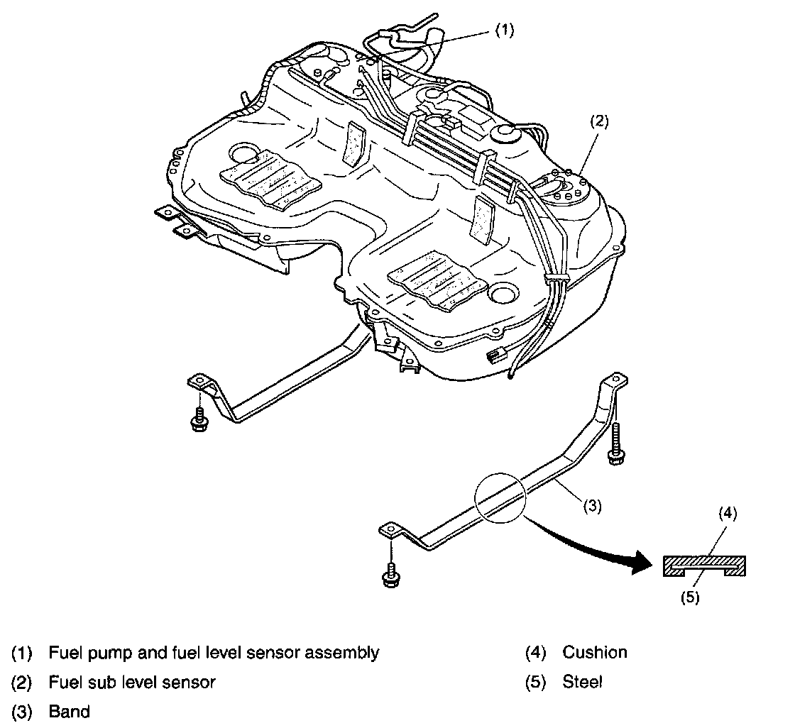 FUEL TANKThe fuel tank utilizes a two-compartment design to ensure sufficient capacity without interfering with the rear differential. It is provided with a suction jet pump (included in the fuel pump and fuel level sensor assembly) which transfers fuel from one compartment to the other. Each compartment has an individual fuel level sensor.