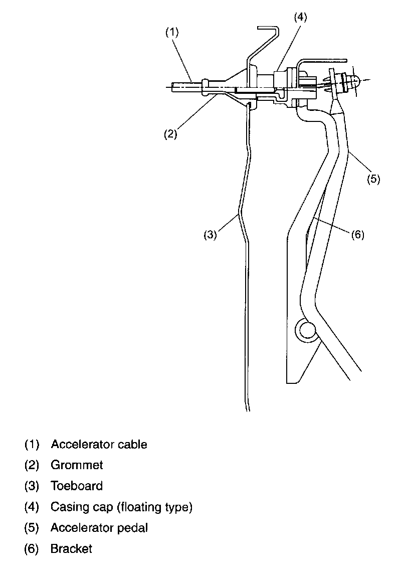 GeneralThe accelerator outer cable is secured to the accelerator pedal bracket rather than to the toeboard. Securing the outer cable in this way has a merit of making the ratio of throttle valve movement to cable stroke less variable. This arrangement is also effective to prevent uneven cable return movement that may result from deformation of the toeboard or improper installation of the accelerator pedal and, therefore, to improve safety.